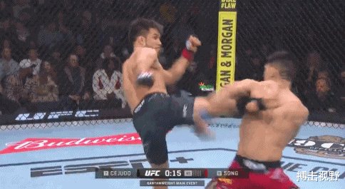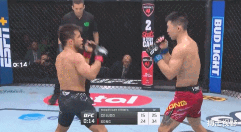 比赛伊始,宋亚东展现了出色的站立打击能力,多次以低扫和刺拳试探对手。回合尾声,他抓住机会,连续重拳击中亨利·赛胡多头部,险些造成击倒。这一波攻势为他赢得了裁判的青睐。