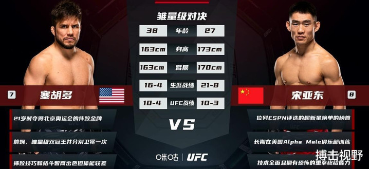 宋亚东的崛起:27岁的宋亚东是中国综合格斗运动的领军人物,此前已在UFC取得多场关键胜利,这是他第四次领衔头条主赛。